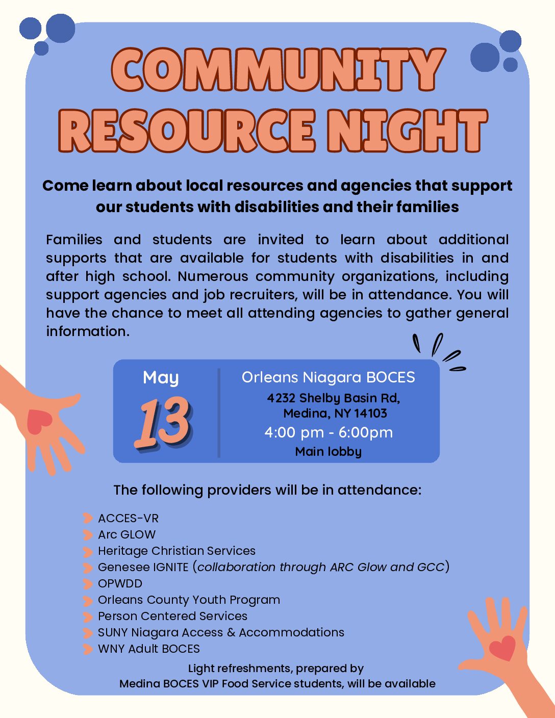 Families and students are invited to learn about additional supports that are available for students with disabilities in and after high school at the Community Resource Night through Medina Central School District at the Orleans Niagara BOCES Main Lobby (4232 Shelby Basin Road). Person Centered Services will be on-site with resources and information from May